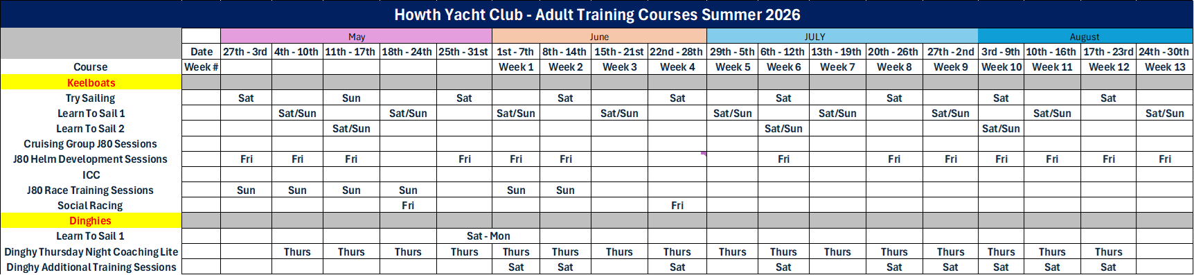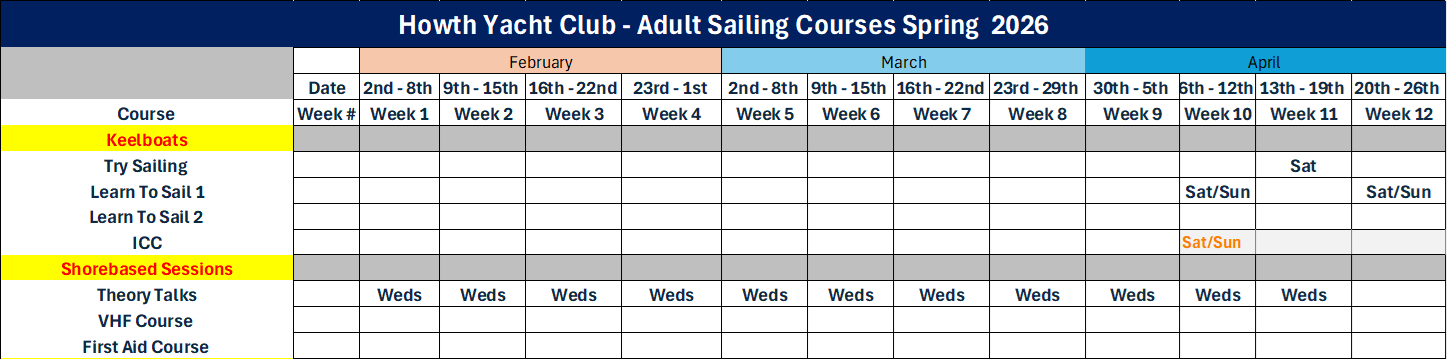 Discover the excitement and lifelong joy of sailing at Howth Yacht Club. There are many ways to begin your sailing journey or further develop your skills, while enjoying time on the water and connecting with other sailors. All courses are led by qualified Irish Sailing instructors and take place in the safe, sheltered waters around Howth and Ireland’s Eye. Explore our Spring and Summer schedules, along with our sailor progression pathway, below — and join us on the water.